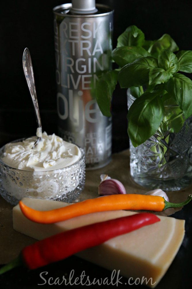 Sekoita maustamattomaan Creme Bonjour tuorejuustoon oliiviöljy, hienonnettu basilika, chili ja valkosipuli. Tämän jälkeen lisää hienoksi raastettu parmesaani sekaan. Lisää ripaus suolaa ja mausta mustapippurilla, tarkista maku. Chilin kanssa kannattaa olla varovainen, käytä vain sen vahvuisia mihin olet tottunut. Itse tykkään tulisista, joten siksi rawit.